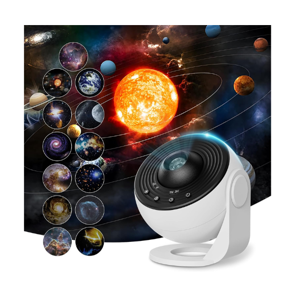 This planetarium galaxy projector has 13 changeable projection discs representing detailed views in the sky including planets, nebula and galaxies. An advanced light system to support wide area project with adjustable focus and 360deg rotating to flexible projection on walls/ceiling. The projector comes with timer settings in which the projector will turn off on its own and will not be loud or disturbing making them suitable for bedrooms or areas that are used for relaxation. Powered by USB and simple insertion of the disc allows this to be used easily every day to decorate.