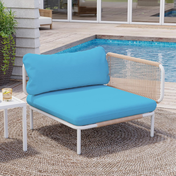 This is a modular outdoor seating set with individual sections that may be rearranged for different spaces or you may use its sections as ottomans and tables with the backrest or armrest removed. Built with a powder coated metal frame, each seats holds plenty of weight along with large area to sit on for maximum comfort. Thick cushions made with quick-dry, water-resistant cloth make the set good for patios, decks and lounging on the edge of the pool. Removable cushion covers allow for easy cleaning and easy set up aids for easy set up.
